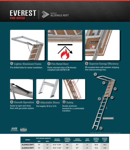 This Louisville Fire Rated Everest Series aluminum attic ladder has a working load capability of 375lbs. This aluminum attic ladder fits ceiling heights of 10′ to 12′ and has a rough opening of 22.5″ X 63″. The Fire Rated Everest AL2240LG-R5FT features a sturdy, yet lightweight design with pre-drilled holes for easier installation. The fire rated door is flame retardant for up to 30 minutes compliant with ASTM E-84. Achieve superior energy efficiency with the R5 insulated door and factory installed weather stripping.It features an easy to open door with gas piston system,adjustable shoes, slip resistant steps, and an aluminum handrail for a comfortable transition. The Louisville AL2240LG-R5FT Fire Rated Everest aluminum attic ladder meets or exceeds the safety standards set by ANSI.