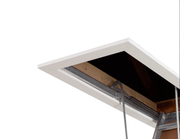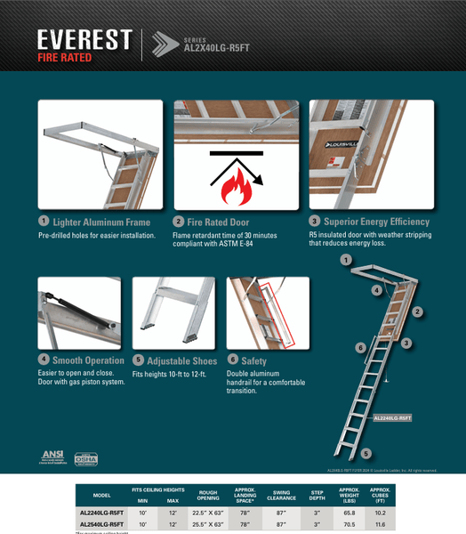 This Louisville Fire Rated Everest Series aluminum attic ladder has a working load capability of 375lbs. This aluminum attic ladder fits ceiling heights of 10′ to 12′ and has a rough opening of 25.5″ X 63″. The Fire Rated Everest AL2540LG-R5FT features a sturdy, yet lightweight design with pre-drilled holes for easier installation. The fire rated door is flame retardant for up to 30 minutes compliant with ASTM E-84. Achieve superior energy efficiency with the R5 insulated door and factory installed weather stripping.It features an easy to open door with gas piston system,adjustable shoes, slip resistant steps, and an aluminum handrail for a comfortable transition. The Louisville AL2540LG-R5FT Fire Rated Everest aluminum attic ladder meets or exceeds the safety standards set by ANSI