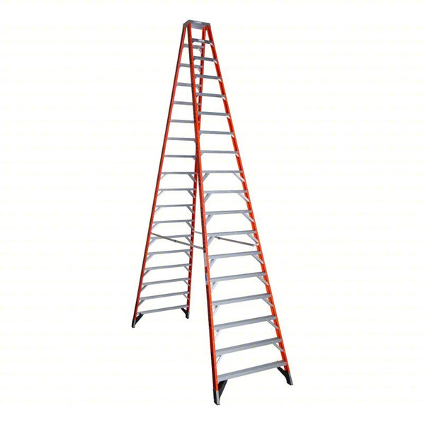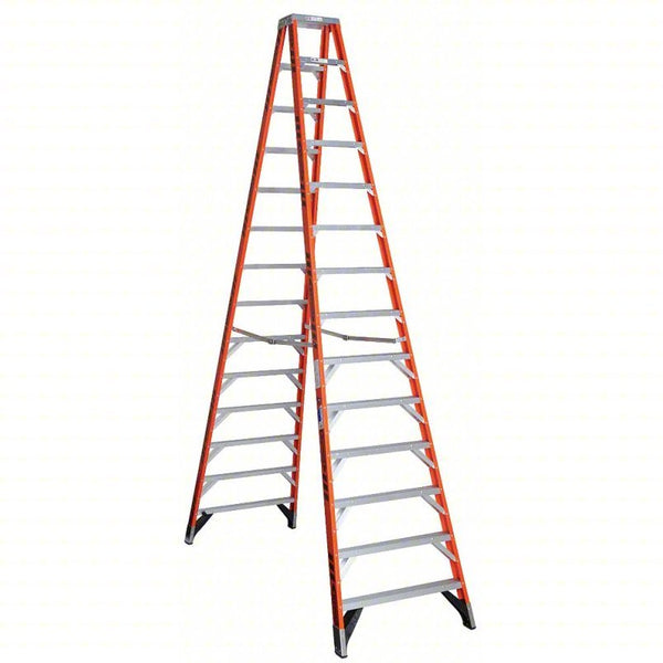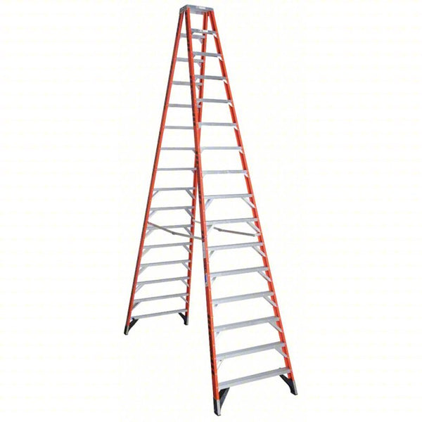 The T7400 Fiberglass Twin Stepladder features a duty rating of 375lb per side of the ladder. Designed for one or two-person jobs, the T7400 ladder has a heavy gauge aluminum top and features heavy duty internal spreaders to resist damage around the worksite or in transit. The GLAS*MARK® Violator stripes on the rails make the ladder more visible and the EDGE® bracing system and external rail shields add to the long lasting durability of these ladders. Fiberglass rails are non-conductive for working near electricity.